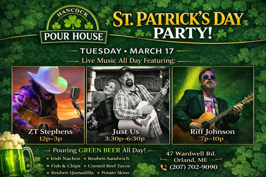 St. Patrick’s Day Special Menu Includes: • Irish Nachos • Reuben Sandwich • Fish & Chips • Corned Beef Tacos • Reuben Quesadilla • Potato Skins • Huge Warm Pretzel Bring your friends, enjoy live local music, and make Hancock Pour House your St. Patrick’s Day destination!