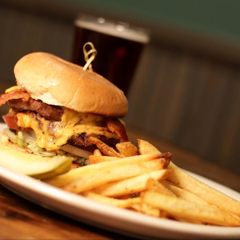 1/2 lb Angus beef, American cheese, lettuce, tomato, and onion. Served with potato chips and a pickle spear.
